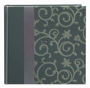 This photo album holds 200 4-inch by 6-inch photos in optically clear plastic pockets with memo area. The album is bookstyle bound in a black fabric cover with tan scroll embroidery and tan ribbon trim. Photos are displayed two per page.